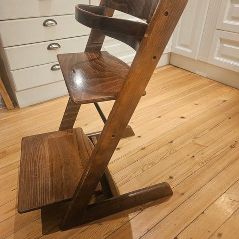 Jeg selger 2 brukte Tripp trapp stoler, en orange og en mellomblå. Begge stolene har brukemerker etter flere barns bruk men har fortsatt et langt liv igjen. Stolene har originalfarger fra da de ble kjøpt. De kan males hvis ønskelig. Bøyle og ekstra rygg for småbarn er inkludert.