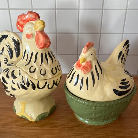 Tyske Zeller Fayencerie hane og høne kanne / mugge. Kannen måler 17 cm i høyden. Kannen har kremfarget/gul base med grønn kant og svart hønsemotiv, egnet for servering og dekorasjon i kjøkkenet.