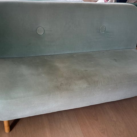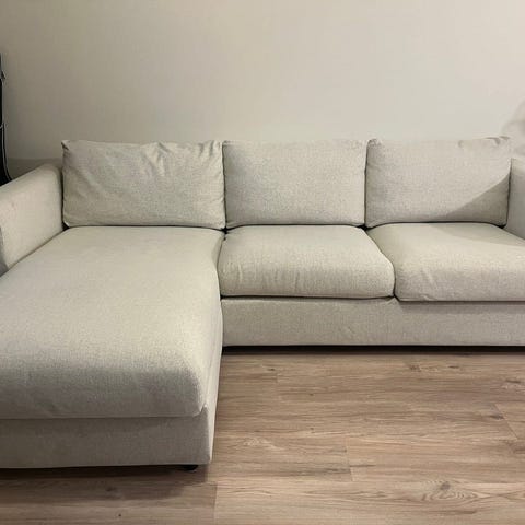 Hjørnesofa gis bort mot henting. Sofaen er godt brukt og har tydelige bruksspor. Trekket er slitt og bør vaskes/renses. Putene er fortsatt brukbare, men sofaen fremstår ikke som pen og egner seg best for deg som trenger en midlertidig løsning, til kjellerstue, hybel, garasje eller lignende.