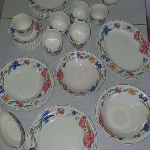 Stort sett med nydelig servise av typen Alpine Meadow by Woods & Sons. Utrolig vakre farger som tar seg meget pent ut på bordet og i skapet.