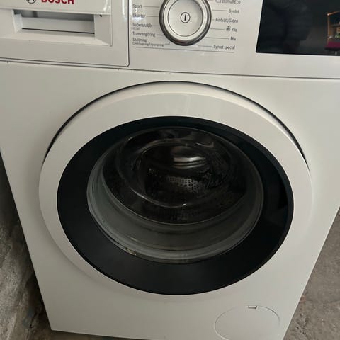 Bosch frontmatet vaskemaskin med hvit farge. Passer til vask av klær og tekstiler med frontåpning for enkel tilgang.