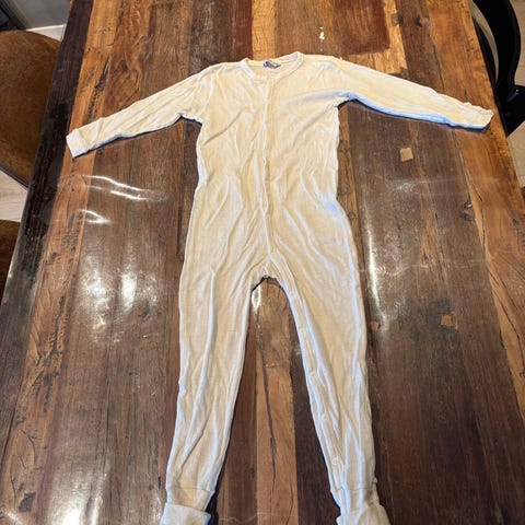 Glidelås foran, elastiske mansjetter og stropper på bena