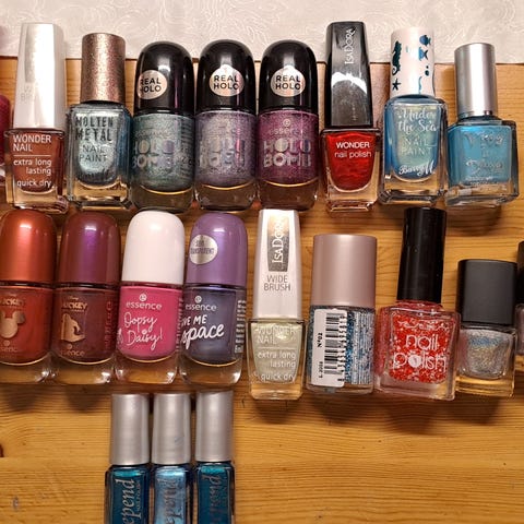 Sett med neglelakker og neglepleieprodukter fra ulike merker. Inneholder flere farger og typer neglelakk, samt verktøy for påføring og neglepleie.