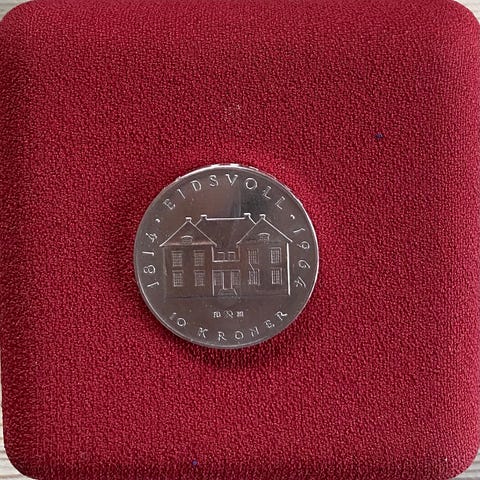 10-kroners jubileumsmynt fra 1964, utgitt i forbindelse med 150-årsjubileet for Norges grunnlov. Mynten er laget av 900/1000 sølv, med 18 gram rent sølv.