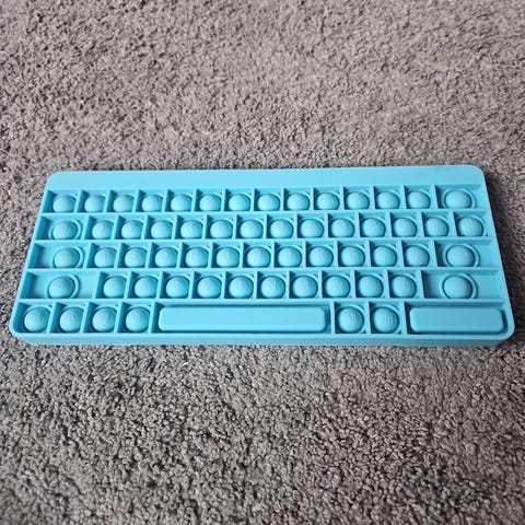 Ergonomisk håndleddsstøtte i grå farge, designet for å gi støtte og komfort ved bruk av tastatur. Laget av mykt materiale med bobleformet overflate for å redusere belastning på håndledd under tastaturbruk.