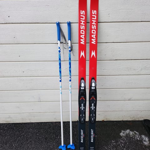 Madshus Racelight MG smørefrie langrennski til barn. Har Rottefellabindinger og er 130 cm lange. Normale bruksmerker men er hele og fine. Hentes i Lørenskog.