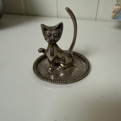 Fin vintage katt i porselen med plass til smykker og ringer bak, også flott som en liten vase. 9 cm høy, basen måler 7 x 4 cm. I god stand bortsett fra litt glasur som mangler bak det ene øret -