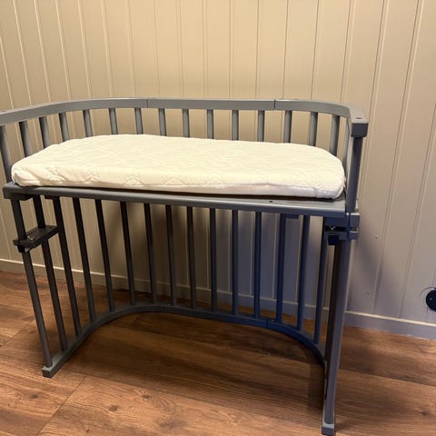 Babybay bedside-crib i god stand. Madrassen er kun brukt noen få ganger (maks 4 uker). Sengen er enkel å feste i foreldrenes seng.