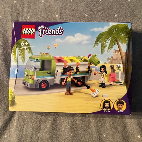 LEGO Friends 41712 Gjenvinningsbil er et sett for miljøbevisste barn, der man blir med Friends-figurene Emma og River på strandrydding for å beskytte dyrelivet. Merk at LEGO-esken har buede sider i stedet for helt rette. Dette er en kjent endring fra LEGO og skyldes blant annet mer effektiv og miljøvennlig emballasje. LEGO-settet består av 259 deler og er anbefalt fra 6 år.
