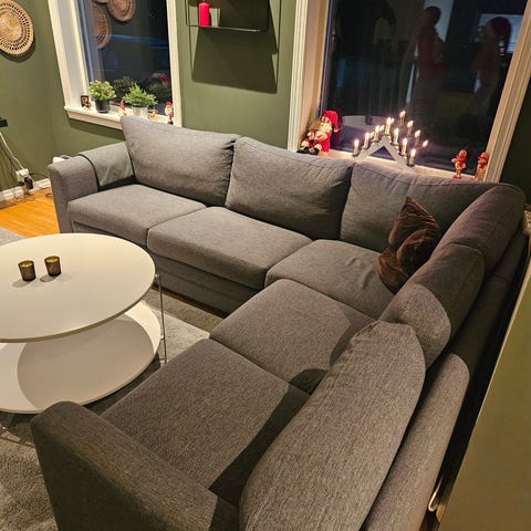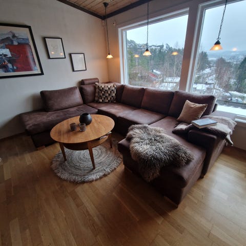 Selger flott sofa fra Skeidar – modell Englegård. Sofaen har åpen ende på høyre side og en romslig sjeselong på 200 cm. Den er 90 cm dyp og 285 cm bred, og gir veldig god sittekomfort.