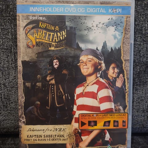 Kaptein Sabeltann Pinky og Ravn på nye eventyr DVD med originalt omslag og DVD-plate. Inneholder del 2 fra TV-serien Kaptein Sabeltann. Produktet er beregnet for barn og inneholder innhold relatert til sjørøvere og eventyr.
