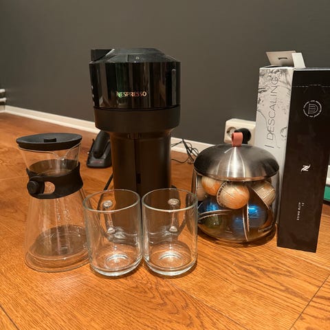 Selger min pent brukte Nespresso Vertuo-kaffemaskin, kjøpt i desember 2023. Maskinen er i utmerket stand, fullt funksjonell og følger med: