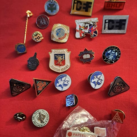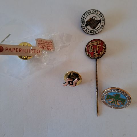 20 pin. Som nye. Fra LO, Forbund, Arbeiderpartier og 1.Mai merker. Porto blir mindre pr. Pin ved kjøp av flere. Kr 40 pr pin.
