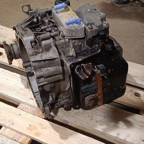 Volkswagen motor girkasse og bakaksel. Motoren har synlige koblinger og tilkoblinger, og bakakselen inkluderer bremser og opphengskomponenter. Passer til reparasjon eller reservedel for Volkswagen kjøretøy 4x4