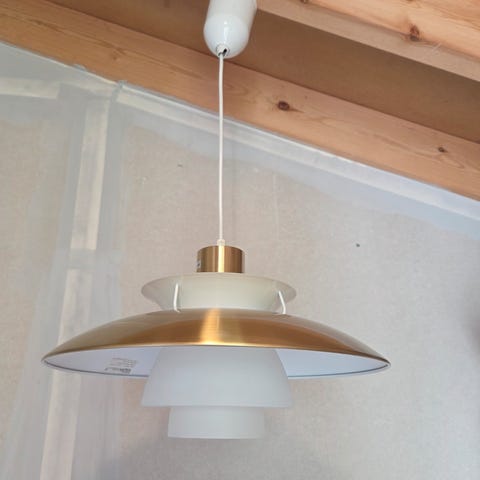 Design lampe frå Louis Paulson. Selges billig fordi siste leddet vart ødelagt å måtte fjernast. Lampen er like fin. Kjøpt ny i 2023