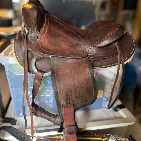 Westernsal til ponni selgast. Kun prøvd på ein gang. Usikker på størrelse,men tipper 13-14". Følgjer med teppe.