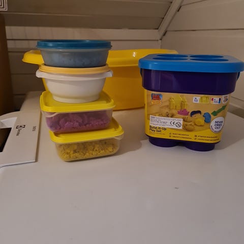 Kinetic Sand lekesett med farget sand og diverse tilbehør som former, verktøy og figurer. Settet inkluderer sand, samt utstyr for forming og lek. Passer for barn og kan brukes til kreativ lek og utvikling av motoriske ferdigheter.