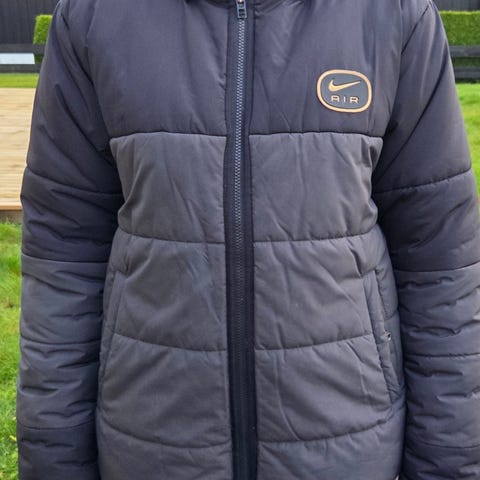 Flott og varm Nike-jakke som har mye liv i seg enda. Det er noen bittesmå hull som er lite synlig og som det bare er å sette liten lapp på. Hengestroppen er røket på ene siden, kan syes😊. Ellers er jakken fin. Se bilder!