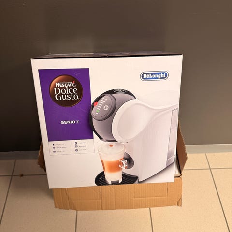 DeLonghi Genio S Plus kapselkaffemaskin i svart farge. Maskinen er designet for bruk med NESCAFÉ Dolce Gusto kapsler og har funksjoner for å lage ulike kaffedrikker.