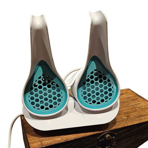 Nett og praktisk skotørker og lader, som enkelt kan festes på veggen. Inkluderer to skotørkere og lader. Farge hvit med blå detaljer. Perfekt for deg med barn som er mye ute.