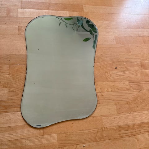 Selger speil med ramme i lakkert tre. Fra siste halvdel av 1980-tallet. Mål: høyde 95 cm, bredde 63 cm. Må hentes.