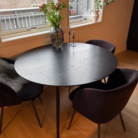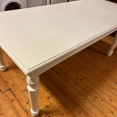 Pent brukt spisebord, hvit plate med Eik ben. Diameter 105