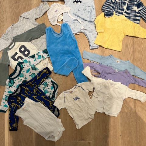 Rimlige babyklær i størrelse 44-56, både nøytrale, jente og gutteklær. Selger også andre ting som svøpepose, smokk, vognpose, gulpeklut.