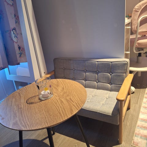 IKEA Lenestol til barn i lyst tre med kremfarget trekk. Lenestolen er designet for barn og har en enkel og funksjonell konstruksjon som gir komfort og støtte.