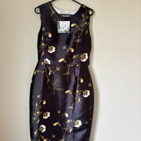 Nydelig kjole i sort chiffon med broderier/perler i gull. Det er en sort, kort underkjole som hører til kjolen. Størrelse 12 som tilsvarer 38/40.