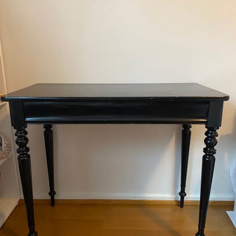 Antikk spillebord med klaffer, laget i tre med mørk finish. Bordet har fire dreide ben og kan utvides ved å slå opp klaffene på sidene. Passer til bruk som spisebord eller arbeidsbord i mindre rom.