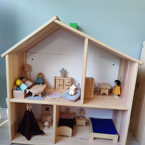 Dukkehus med møbler og figurer.