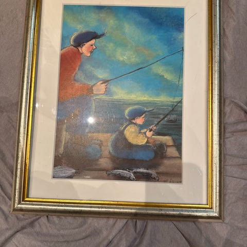 Norman Rockwell kunsttrykk med signatur og nummerering 281/1950. Motivet viser en person som fisker fra en båt, med detaljer i farger. Trykket er innrammet og har en tydelig etikett på baksiden med informasjon om utgaven.