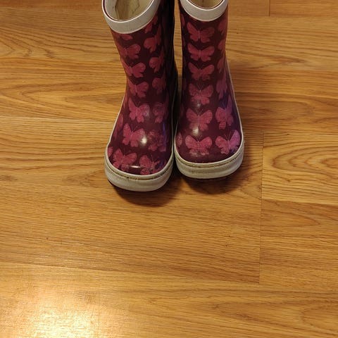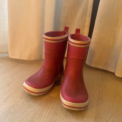 Gummistøvler for jente i størrelse 26 med blomstermønster. Støvlene er laget for å gi beskyttelse mot vann og gjørme, egnet for bruk i våte og gjørmete forhold.