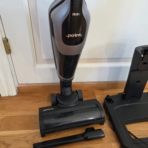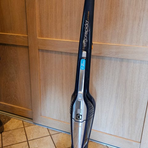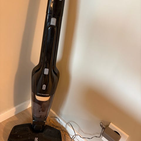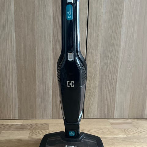 Håndholdt støvsuger fra Grundig. Eldre modell, men lite brukt. Skal være særlig utviklet for dyrehår, men har ikke dyr. Støvsugeren er rengjort før salg. Må hentes. Modellen heter Cyclonic 21.6V. Skaftet kan klappes sammen for enklere lagring, den har en avtagbar liten støvsugerdel med eget børstemunnstykke (sees tapet fast på håndtaket) og en «ladestasjon» der støvsugeren kan stå oppreist. Trenger ikke monteres fast på veggen.
