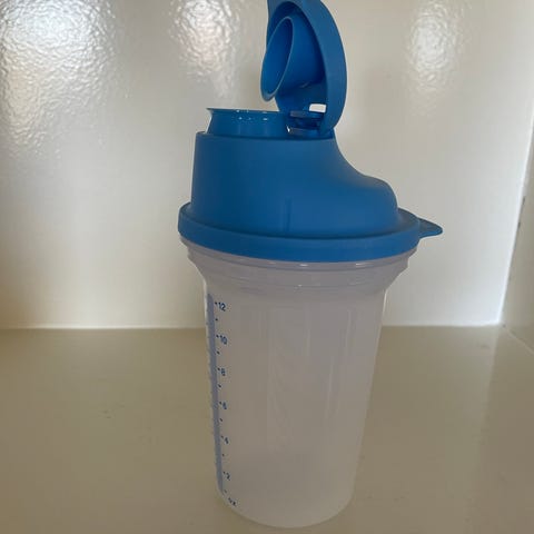 Beholderen er transparent og har måleenheter for hver 50 ml opptil 1,2 l. Med trakten kan du enkelt tilsette væske underveis når du f.eks. pisker majones.
