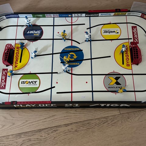 Stiga Play Off 21 bordhockeyspill med spillere og målbur. Spillbordet har ben for støtte og er designet for innendørs bruk. Passer til bordhockeyentusiaster.