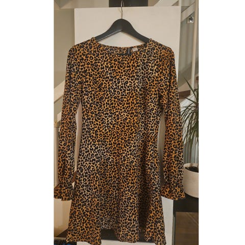 Kjole med leopardmønster str. m. Normal str. Det er strech i kjolen. Behagelig og sitter pent på. Kjolen er ny og ubrukt, men merkelappen er tatt av.