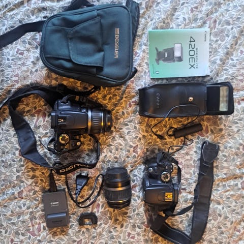 Selger et Canon EOS 350D speilreflekskamera i fungerende stand. Kameraet er enkelt å bruke og passer godt for nybegynnere som vil lære seg fotografering med speilrefleks, eller som et rimelig ekstrakamera.
