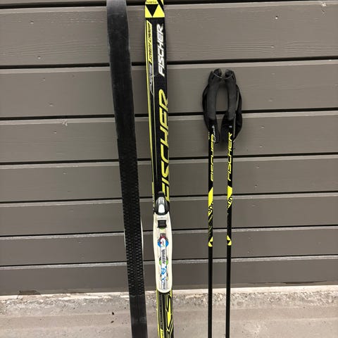 Fischer langrennsski med en lengde på 120 cm. Skiene har bindinger og staver inkludert. Egnet for bruk på preparerte løyper.