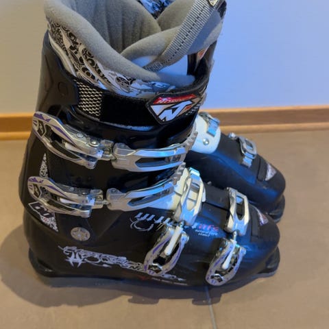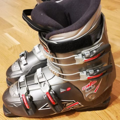 Nordica skistøvler med størrelse 315 mm. Fargekombinasjon i svart og sølv. Utstyrt med fire spenner for justering og god passform.