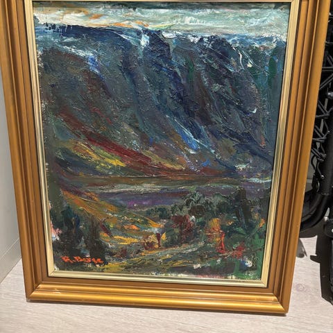 Olje på lerret maleri som viser et landskap med fjell og trær. Maleriet er innrammet i en gullfarget ramme. Passer til dekorasjon i hjem eller kontor.