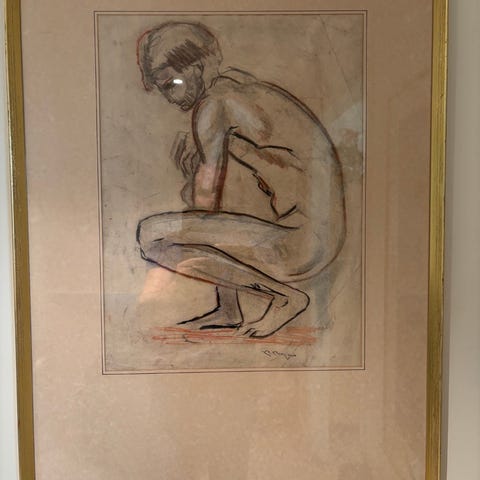 i form av et oljemaleri som forestiller et landskap med trær. Maleriet er innrammet i en gyllen ramme.
