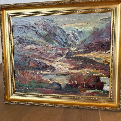 Maleri av et landskap malt med olje på lerret. Bildet viser et fjellandskap med dal og himmel, i en ramme av tre.