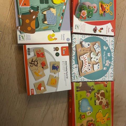 Djeco Primo Puzzle og Puzzle Géant puslespill med dyremotiv i flere sett. Alle settene er komplette, og inkluderer puslespill med mellom 4 til 12 brikker, med fargerike illustrasjoner av ulike dyr.