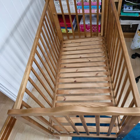 Fin sprinkelseng i tre. Montert på møbelknotter på den siden som har stått mot veggen. Dessverre lite brukt da ungene helst ville sove oppå meg og ikke i egen seng