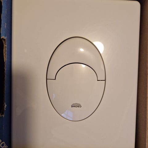 Grohe Skate Air betjeningsplate i hvit farge. Produktet leveres i original emballasje og består av en betjeningsplate for toalett. Vi har gått for en annen trykkplate. Kun åpnet for å ta bilder.