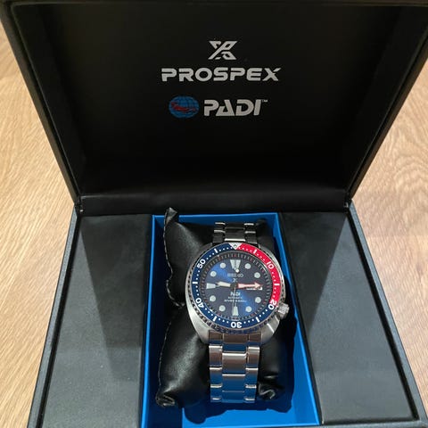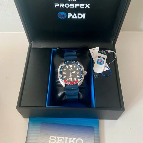 Seiko dykkerklokke for unisex med stållenke og en urskive i blått og rødt. Klokken har en robust konstruksjon egnet for daglig bruk og aktiviteter som krever nøyaktig tidtaking. Den har en tydelig urskive med visere og markeringer for enkel avlesning. Padi special edition og en av turtle modellene sine beste fargekomboer. Litt småriper etter desk diving men stått mye i skapet så rimelig strøken enda. Boks og papirer medfølger.