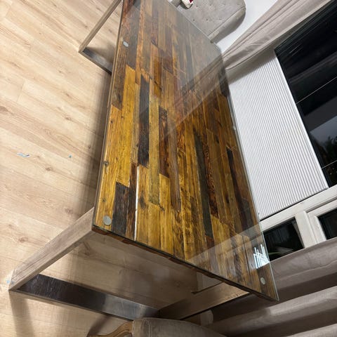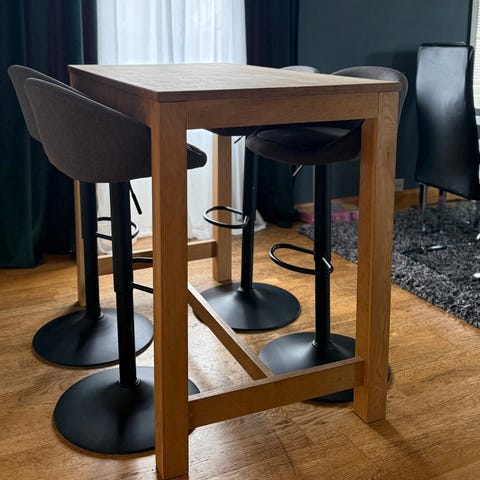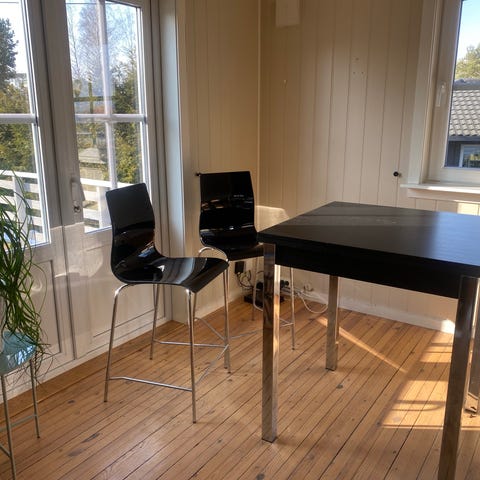 Selger et kjøkken barbord med 4 stoler i skinn . Settet er god og solid, men bordet er ikke i massiv tre. Det er eik finne, men solid. Jeg vil endre stilen på kjøkkenet. Derfor selger jeg det. Det er i god stand. Ingen synlige skader. Flotte, solide, gode å sitte på, stoler i sort skinn. Ingen synlige skader. I utgangspunkt et flott sett, men jeg vil ha noe annet.
