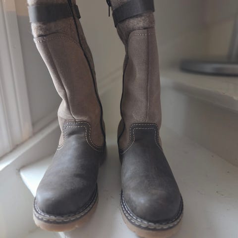 Gode varme støvletter, fôret med lammeull. Semsket skinn i en en grå/beige farge på utsiden. De er godt brukt, men ingen skader, utenom normal slitasje etter to år. Brukt på de kaldeste dagene. Selges rimelig, da de fortsatt har bruksverdi. Veldig varme og behagelige sko. Jeg har satt inn ny ullsåle.