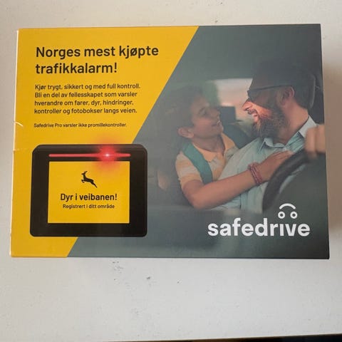 Safedrive Pro trafikklammer for kjøretøy. Produktet inkluderer en enhet med skjerm, monteringsutstyr og tilbehør. Designet for å hjelpe med trafikksikkerhet ved å gi informasjon og varsler under kjøring.